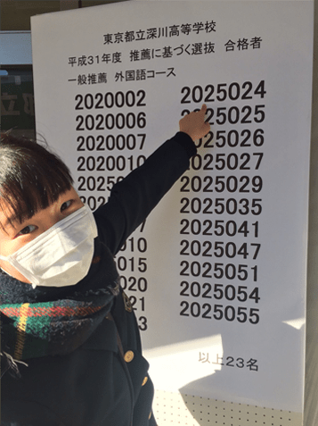 いざ高校受験を迎えた時には、推薦入試の作文を自信を持って書くことができました。深川高校の外国語コースは、都立高校の中でも、推薦入試の倍率が高い難関校です。東京都教育委員会の出している資料に則り、グローバルな考え方と自立した人物像を磨き上げ、志望動機の裏付けができたのは、眞野先生の指導を受けていたおかげだと思います。